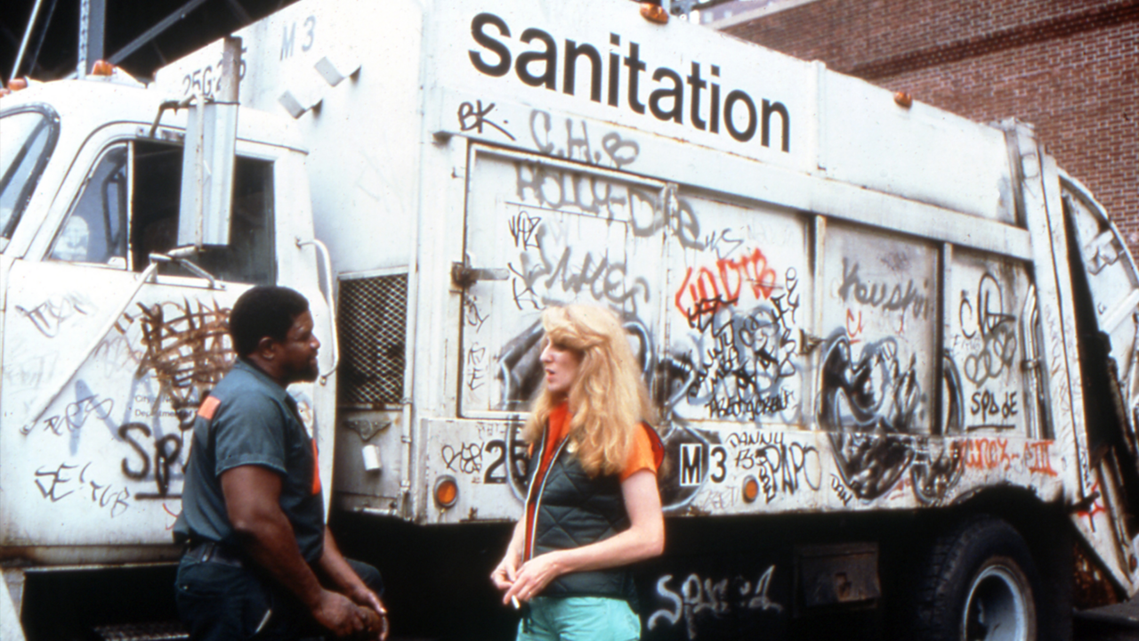1979, New York City. At their work site, sanitation workers give their undivided attention to a woman who’s stopped by for a visit. They listen to her speak, but stand with their arms folded. “Good morning! My name is Mierle Laderman Ukeles. I’m a maintenance artist. I feel that you hold up the whole city in your hands with your unending work. I think it’s time for the public to hear what New York City feels like, from the side of the people that keep it alive, every single day.” With that, Ukeles initiated one of her most ambitious and socially-conscious works — pursuing the idea that acts of individual social maintenance, including sanitation work, could be deemed a form of performance art.